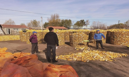 今年11月初,双辽市卧虎镇前六家子村全力解决“地趴粮”。图为农民们正在把玉米储存到“栈子”里。 张树明 摄